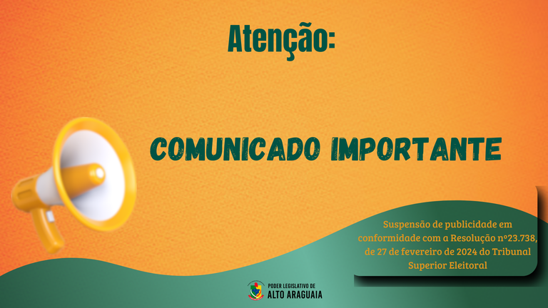 Em conformidade com a Resolução Nº 23.738, de 27 de fevereiro de 2024, do Tribunal Superior Eleitoral, a Câmara Municipal de Alto Araguaia informa que, durante o período eleitoral, compreendido entre os dias 6 de julho e 6 de outubro, irá ocultar as notícias divulgadas aqui no site e em nossas redes sociais (instagram, facebook e youtube), ficarão suspensas as transmissões ao vivo das Sessões Ordinárias, os munícipes poderão assistir somente presencialmente a partir dessa data.